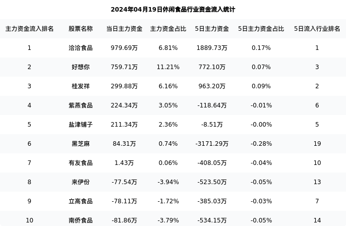 下表为今日行业内流入前10股票的信息
