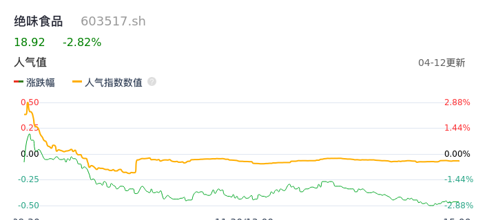 04月12日,绝味食品收报18.92,股价涨幅-2.82%,成交金额1.60亿元,换手率1.35%。