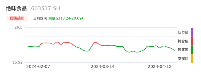 我们来看一下该股的九方特色指标强弱趋势的情况:绝味食品自03月14日从持仓区下穿到观望区,股价近期持续走弱。短期已经进入空头行情,且下跌动能仍未衰竭。建议继续谨慎观望。