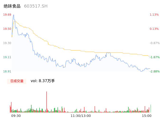 04月12日,绝味食品收报18.92,股价涨幅-2.82%,成交金额1.60亿元,换手率1.35%。