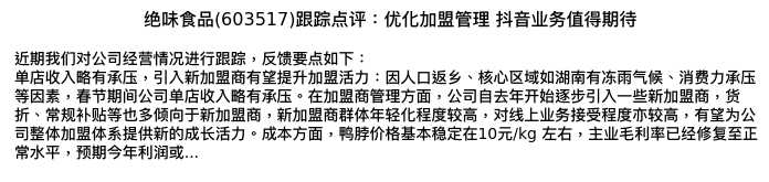 值得注意的是:2024年03月光大证券的叶倩瑜/杨哲/李嘉祺/董博文分析师,首次发布关于绝味食品的研究报告,标题为:绝味食品(603517)跟踪点评:优化加盟管理 抖音业务值得期待。