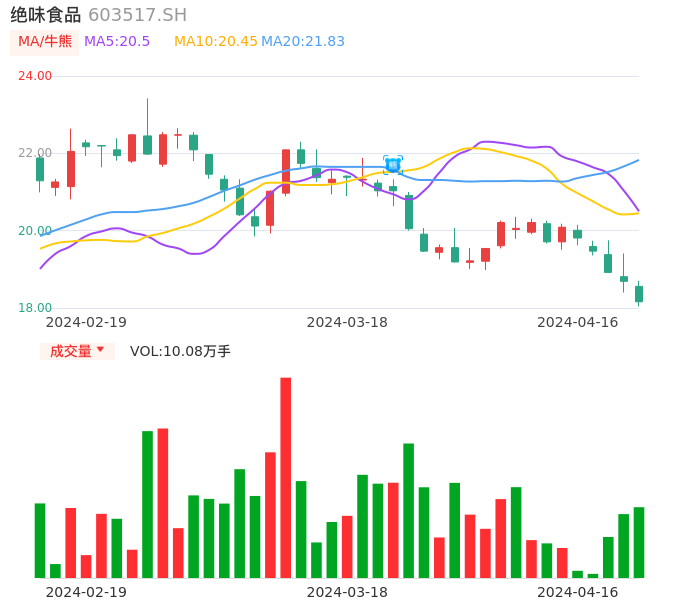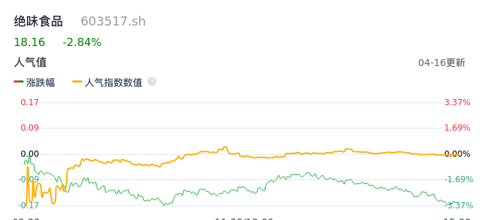 04月16日,绝味食品收报18.16,股价涨幅-2.84%,成交金额1.84亿元,换手率1.63%。