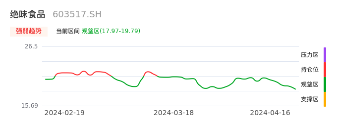 我们来看一下该股的九方特色指标强弱趋势的情况:绝味食品自03月14日从持仓区下穿到观望区,股价近期持续走弱。短期已经进入空头行情,且下跌动能仍未衰竭。建议继续谨慎观望。