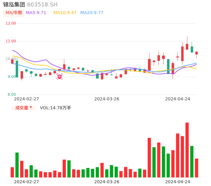 04月24日,锦泓集团收报10.40,股价涨幅0.29%,成交金额1.52亿元,换手率4.30%。