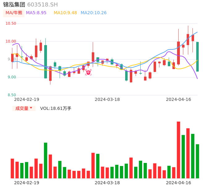 04月16日,锦泓集团收报9.16,股价涨幅-10.02%,成交金额1.75亿元,换手率5.42%。