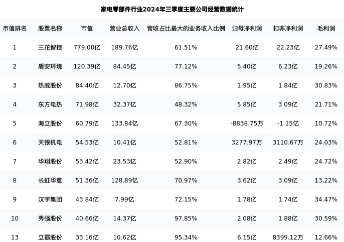 立霸股份最新报告期数据为三季度,下表汇总了家电零部件行业内市值靠前的公司三季度主要经营数据