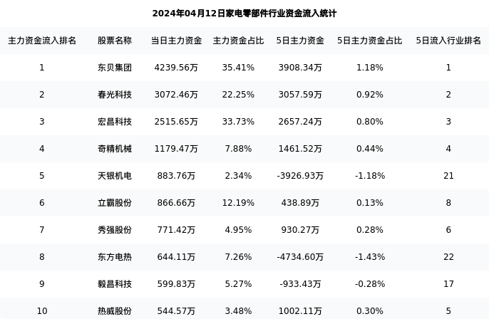 从主力资金流向来看,家电零部件行业今日主力资金流入8.92亿元,在所有申万二级行业中排名:45/131。