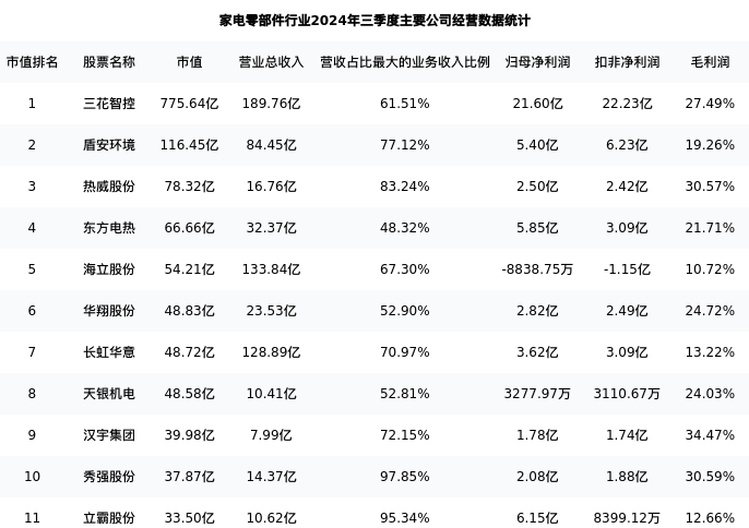 立霸股份最新报告期数据为三季度,下表汇总了家电零部件行业内市值靠前的公司三季度主要经营数据