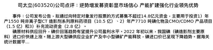 值得注意的是:2024年04月国盛证券的张金洋/胡偌碧/陶宸冉分析师,首次发布关于司太立的研究报告,标题为:司太立(603520)公司点评:逆势增发募资彰显市场信心 产能扩建强化行业领先优势。