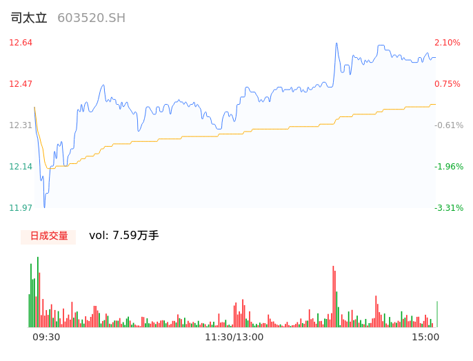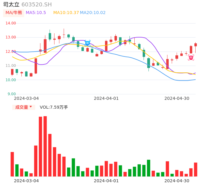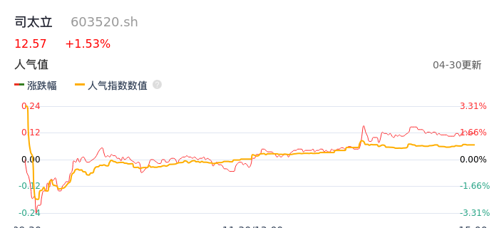 04月30日,司太立收报12.57,股价涨幅1.53%,成交金额9400.18万元,换手率2.22%。