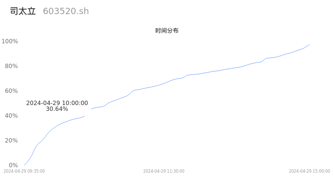 首先我们来看当日成交的时间分布。将今日交易时间按照5分钟的时间间隔进行切片,并绘制分布直方图进行观察。可以发现,10点之前的成交量占全天成交量的30.64%,这说明,该股票活跃时段换手火爆,资金热情高涨。