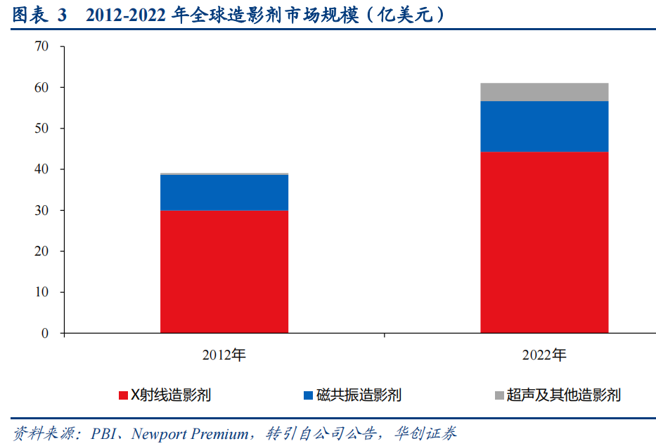 根据行业研究机构PBI研究报告数据显示,2022年全球造影剂终端制剂规模约为61.08亿美元,并以6.8%的年复合增长率持续增长,未来十年有望接近120亿美金。其中,X射线造影剂目前仍是全球造影剂市场的主体,在总市场中占比达到73%。