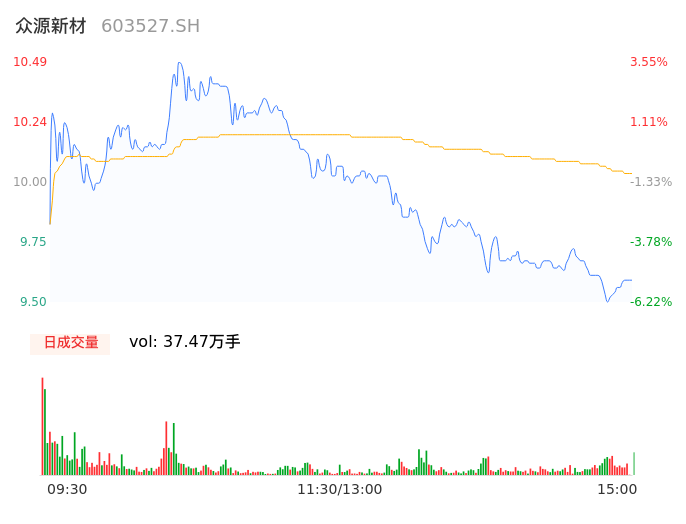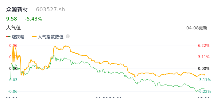 04月08日,众源新材收报9.58,股价涨幅-5.43%,成交金额3.76亿元,换手率11.82%。