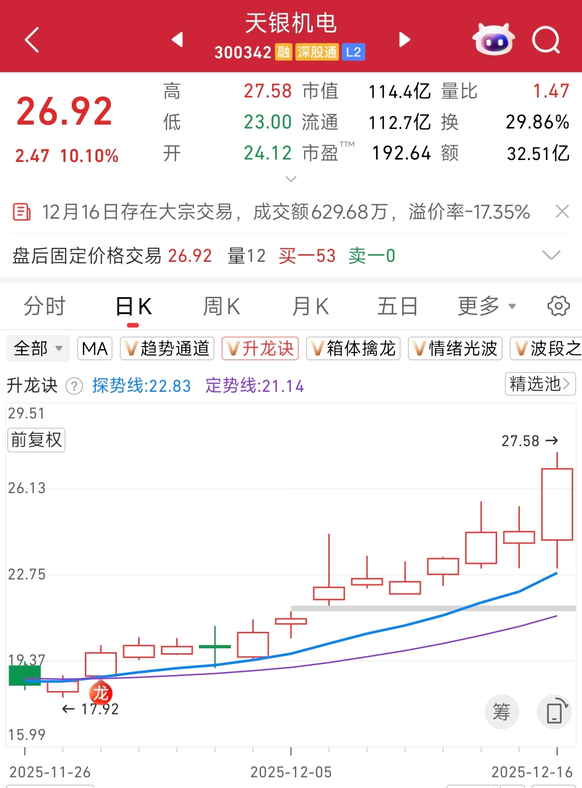 根据“升龙诀”监控,今日涨停的天银机电,在11月28日提示了“升龙”信号,随后开启了主升浪上涨,迄今已涨45%。