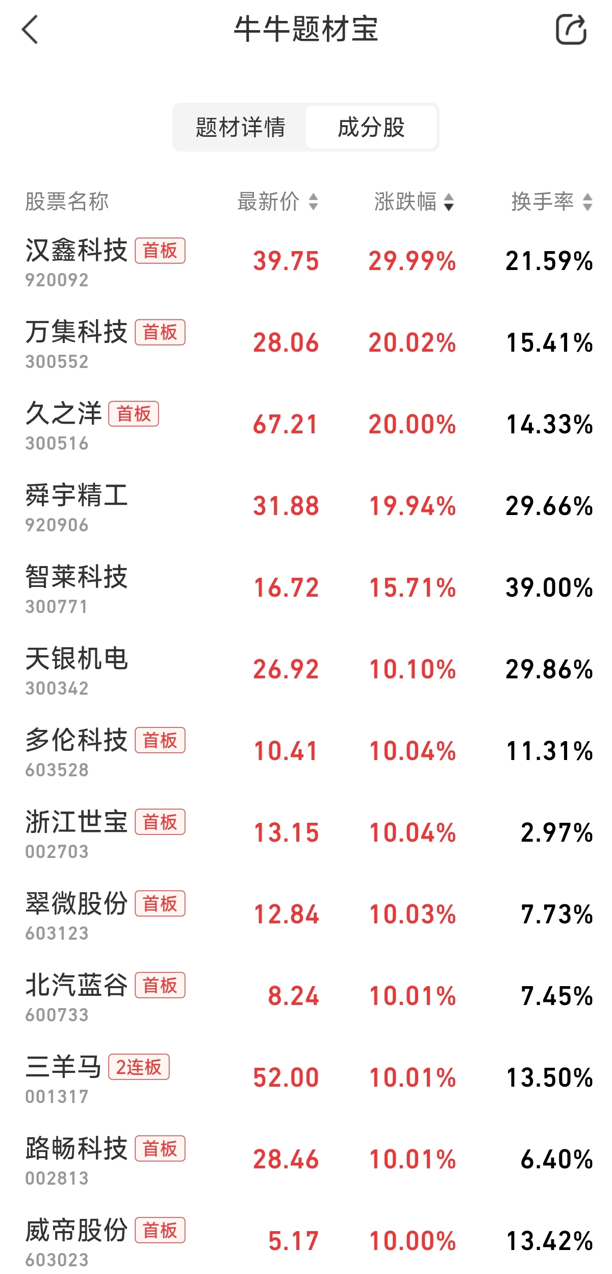 反映到市场上,隔夜美股特斯拉涨3%,而A股更是批量涨停。北汽蓝谷回封涨停,多伦科技、路畅科技直线涨停,此前汉鑫科技、威帝股份、索菱股份、锦江在线等多股涨停,舜宇精工、云星宇、三友科技、豪恩汽电涨超10%。