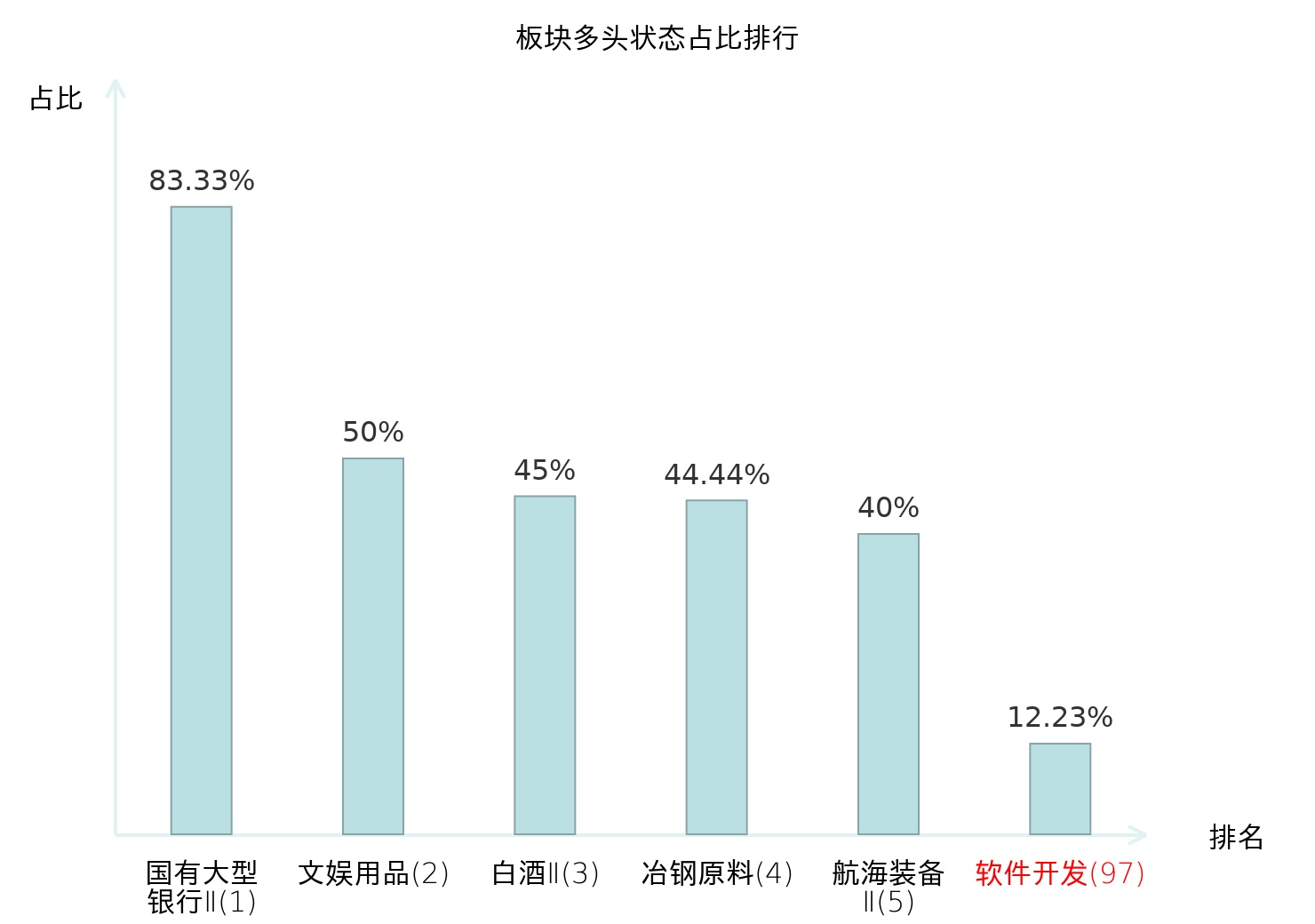 全市场所有行业板块中主力多头状态占比排名中,国有大型银行Ⅱ板块位居第一。其他家电Ⅱ板块名次提升最快,较昨日上升116位。
