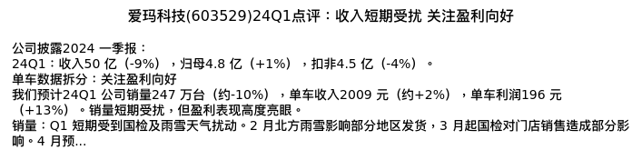 值得注意的是:2024年04月中泰证券的姚玮分析师,首次发布关于爱玛科技的研究报告,标题为:爱玛科技(603529)24Q1点评:收入短期受扰 关注盈利向好。