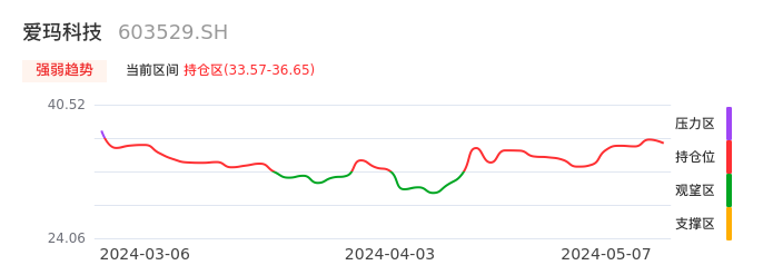 我们来看一下该股的九方特色指标强弱趋势的情况:爱玛科技自04月15日从观望区上穿到持仓区。股价近期在多头区域回调整理。后续重点关注多空分界点的争夺:33.57元。如未能有效站稳则可能重新回到空头行情。