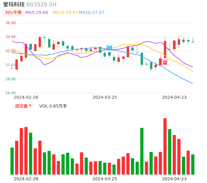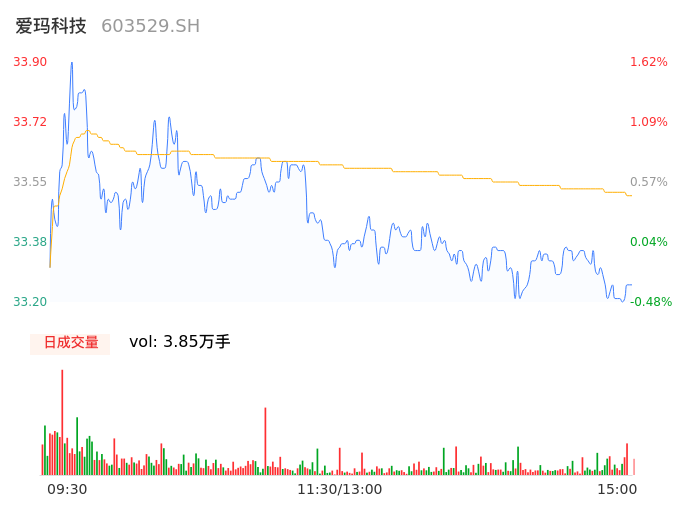 04月23日,爱玛科技收报33.25,股价涨幅-0.33%,成交金额1.29亿元,换手率1.72%。