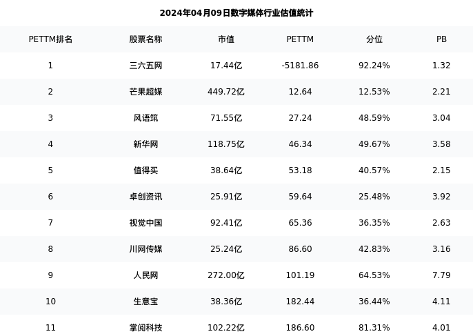 从估值角度看:掌阅科技最新市盈率PETTM为186.60,在行业内排名10/13,处于81.31分位。