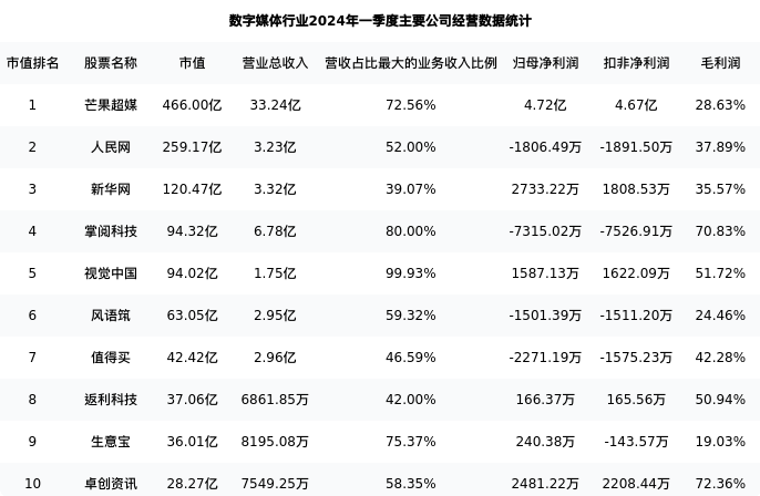 掌阅科技最新报告期数据为一季度,下表汇总了数字媒体行业内市值靠前的公司一季度主要经营数据