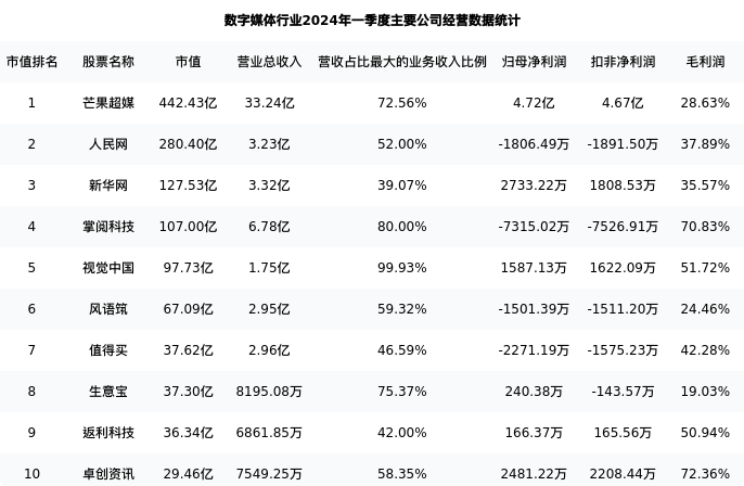 掌阅科技最新报告期数据为一季度,下表汇总了数字媒体行业内市值靠前的公司一季度主要经营数据