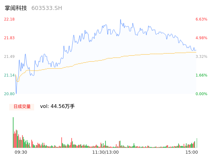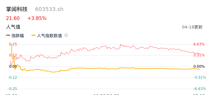 04月18日,掌阅科技收报21.60,股价涨幅3.85%,成交金额9.63亿元,换手率10.17%。