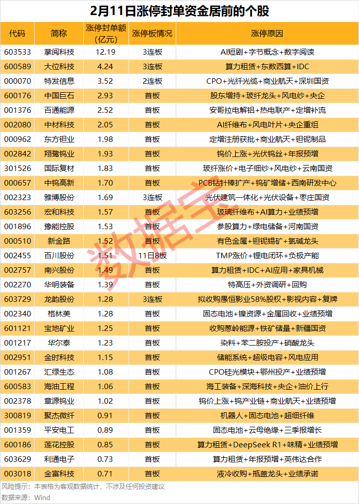 以封单金额计算,掌阅科技、大位科技、特发信息等涨停板封单资金居前,分别有12.19亿元、4.24亿元、3.52亿元。