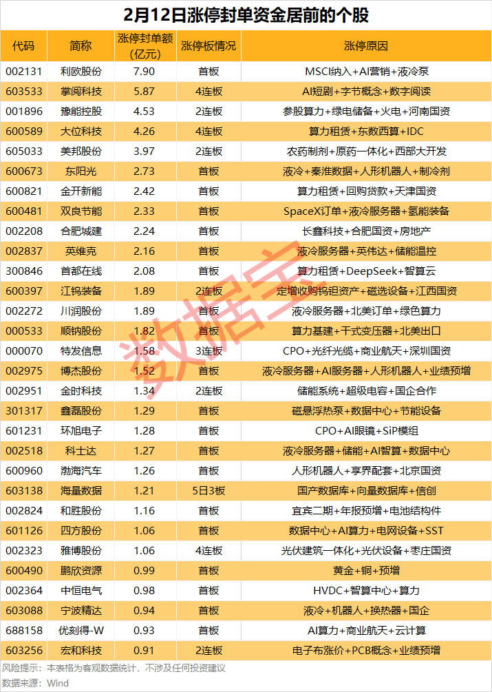 AI营销概念股利欧股份尾盘突然拉涨停,封单量达87.03万手。消息面上,近日AI应用层面利好频出。2月12日,字节视频创作模型Seedance 2.0正式发布。该模型支持多模态全能参考,允许组合输入不同文本、图片、视频、音频,同时新增视频编辑能力,支持对指定片段、角色、动作或剧情进行定向修改,还提供了视频延长功能。目前,该模型已上线即梦AI、豆包等平台。