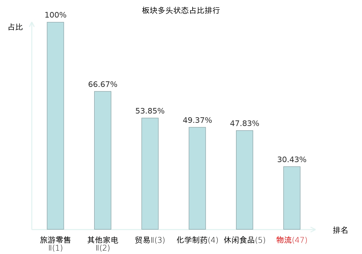 全市场所有行业板块中主力多头状态占比排名中,旅游零售Ⅱ板块位居第一。互联网电商板块名次提升最快,较昨日上升55位。