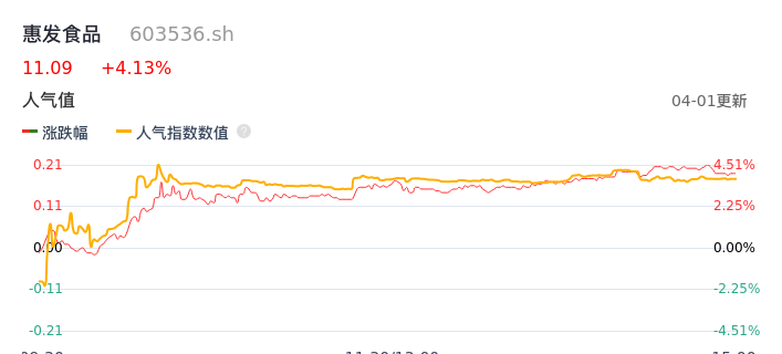 04月01日,惠发食品收报11.09,股价涨幅4.13%,成交金额1.90亿元,换手率7.11%。