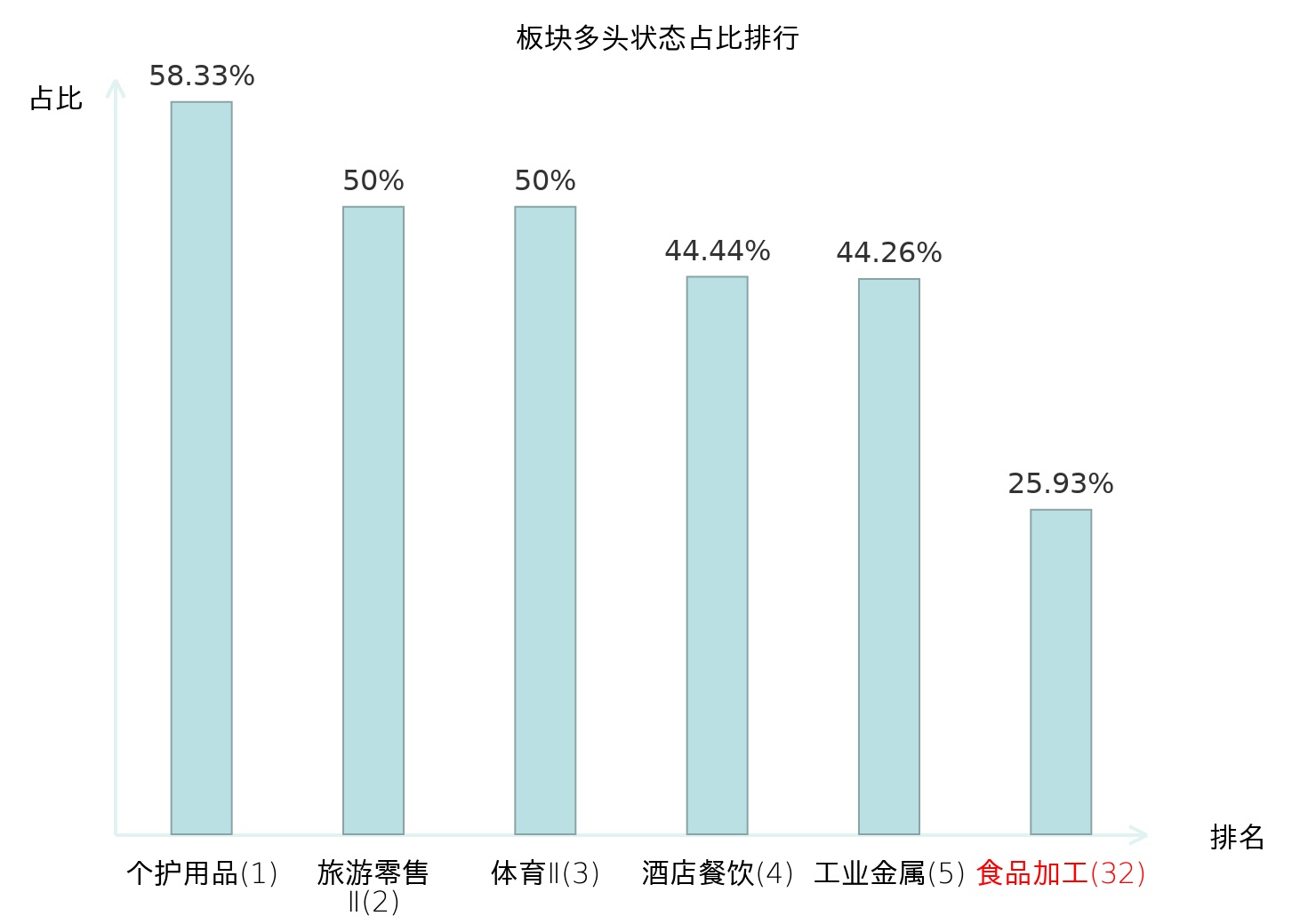 全市场所有行业板块中主力多头状态占比排名中,个护用品板块位居第一。非白酒板块名次提升最快,较昨日上升65位。
