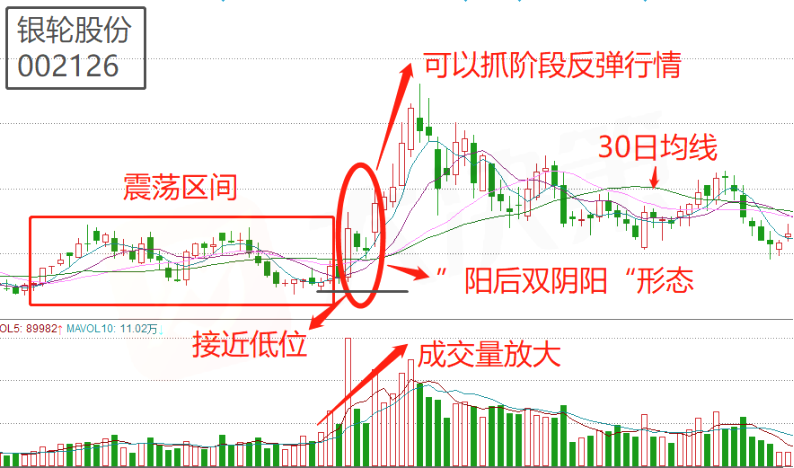 上图银轮股份也是一样,股价在前期经过了很长一段时间的区间震荡,在接近低位的位置出现了"阳后双阴阳"的技术形态,第4根为中阳线,开盘价和收盘价都高于第1根阳线,成交量配合显著放大,这就说明多头占优。
