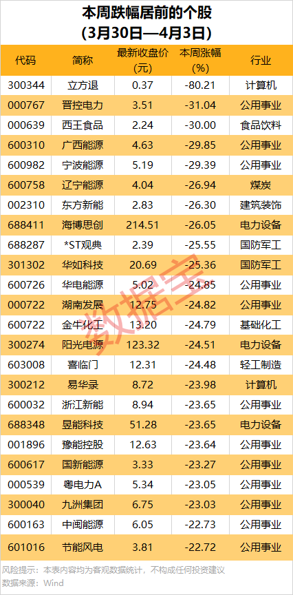本周累计下跌的个股中,超460股跌幅在10%以上,立方退累计跌80.21%,居首;晋控电力、西王食品、广西能源等跌幅均超20%。
