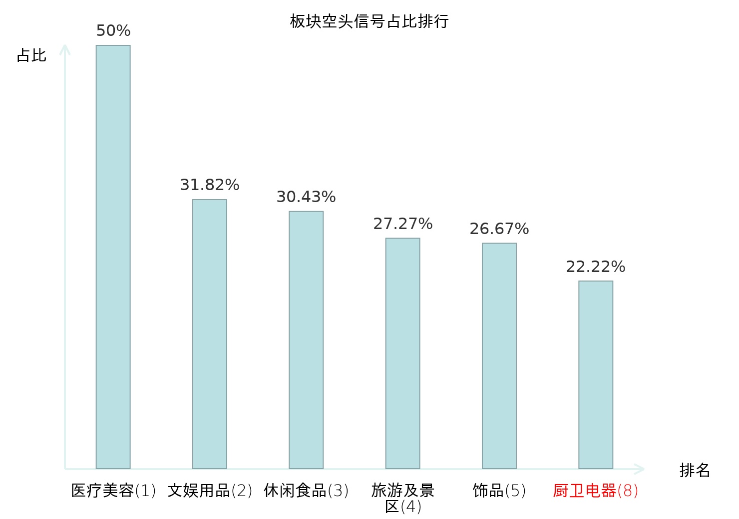 全市场所有行业板块中主力空头信号占比排名中,医疗美容板块位居第一。服装家纺板块名次提升最快,较昨日上升114位。