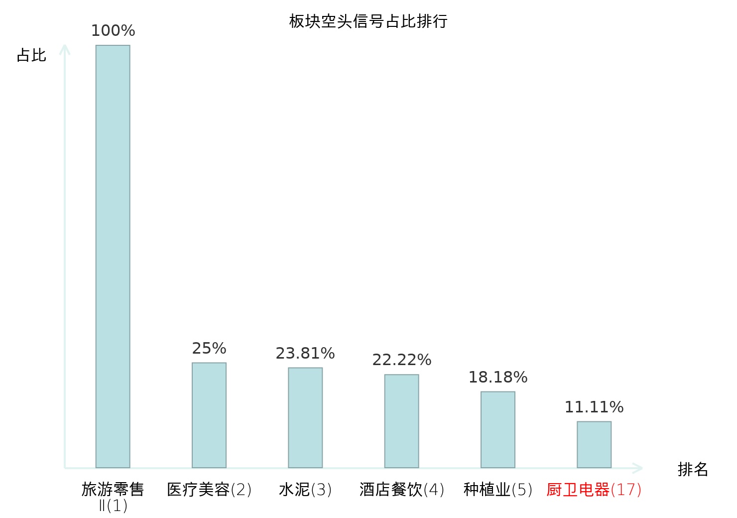 全市场所有行业板块中主力空头信号占比排名中,旅游零售Ⅱ板块位居第一。装修建材板块名次提升最快,较昨日上升112位。