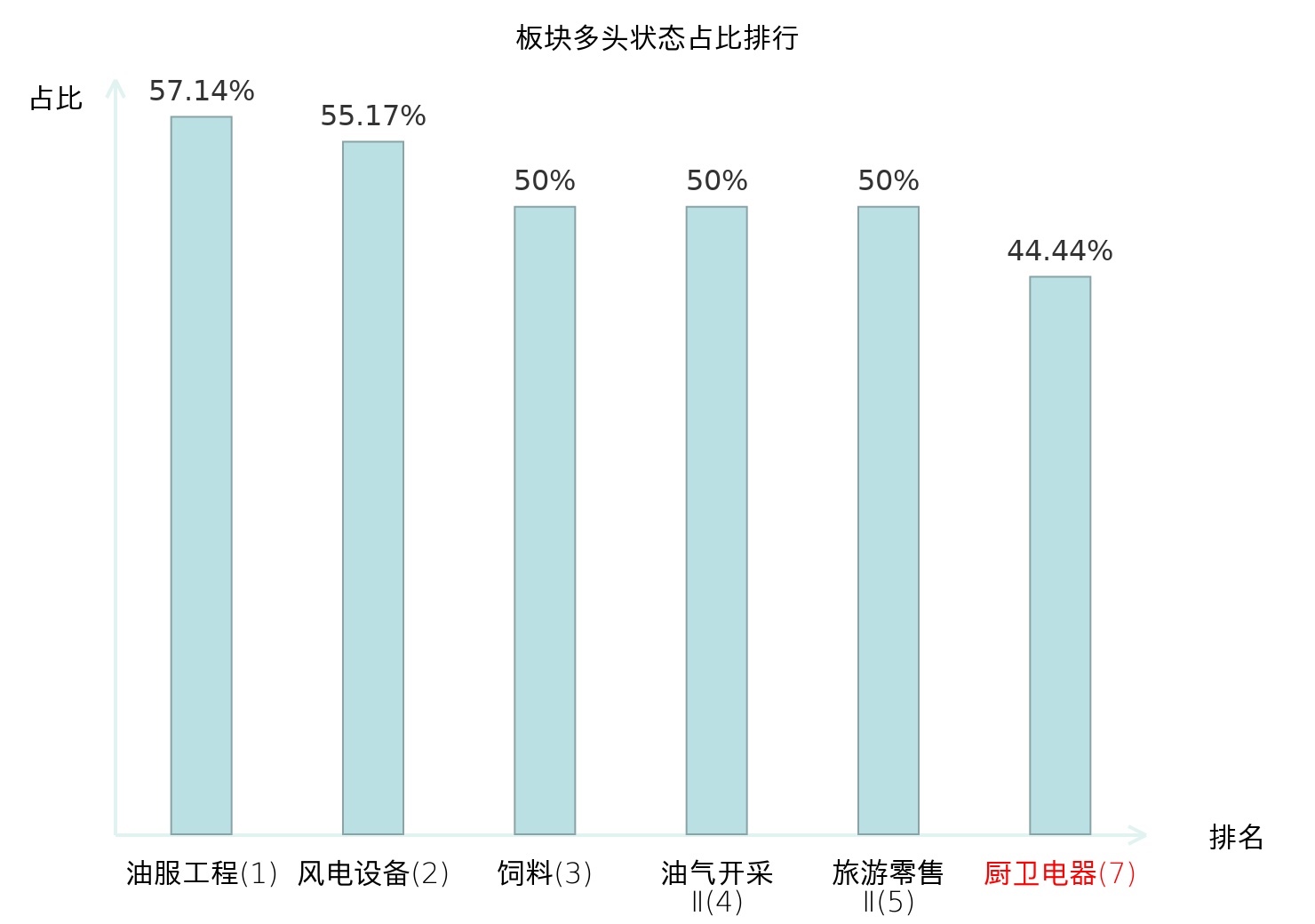 全市场所有行业板块中主力多头状态占比排名中,油服工程板块位居第一。非金属材料Ⅱ板块名次提升最快,较昨日上升67位。