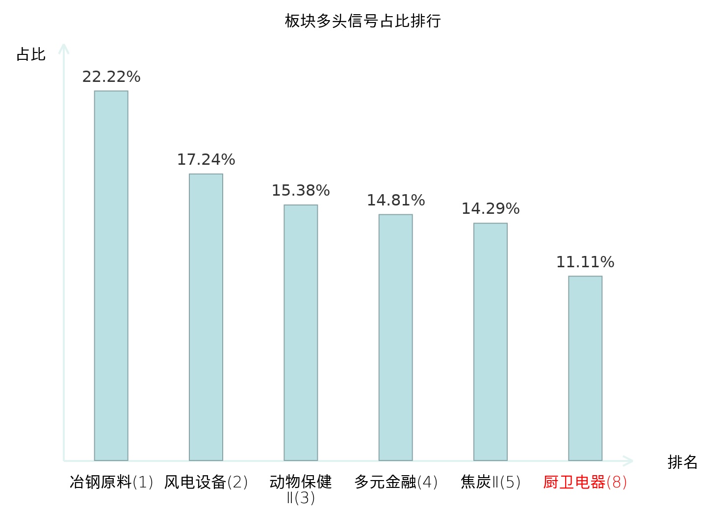 全市场所有行业板块中主力多头信号占比排名中,冶钢原料板块位居第一。冶钢原料板块名次提升最快,较昨日上升118位。