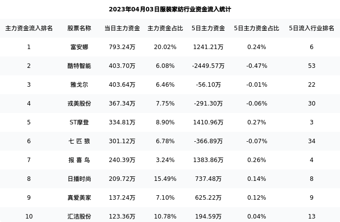 从主力资金流向来看,服装家纺行业今日主力资金流入6.62亿元,在所有申万二级行业中排名:43/131。
