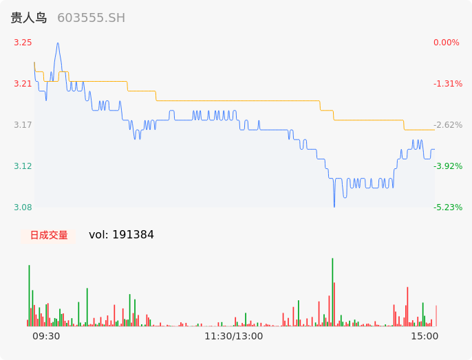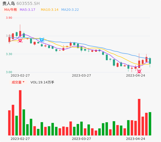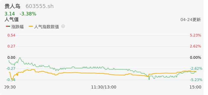 04月24日,贵人鸟收报3.14,股价涨幅-3.38%,成交金额6050.03万元,换手率1.22%。