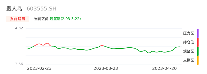 我们来看一下该股的九方特色指标强弱趋势的情况:贵人鸟自03月23日从持仓区下穿到观望区。股价近期持续下跌后,短期出现止跌迹象。后续重点关注能否再次站上多空分界点:3.22元。如未能有效突破则可能进入新一轮空头行情。