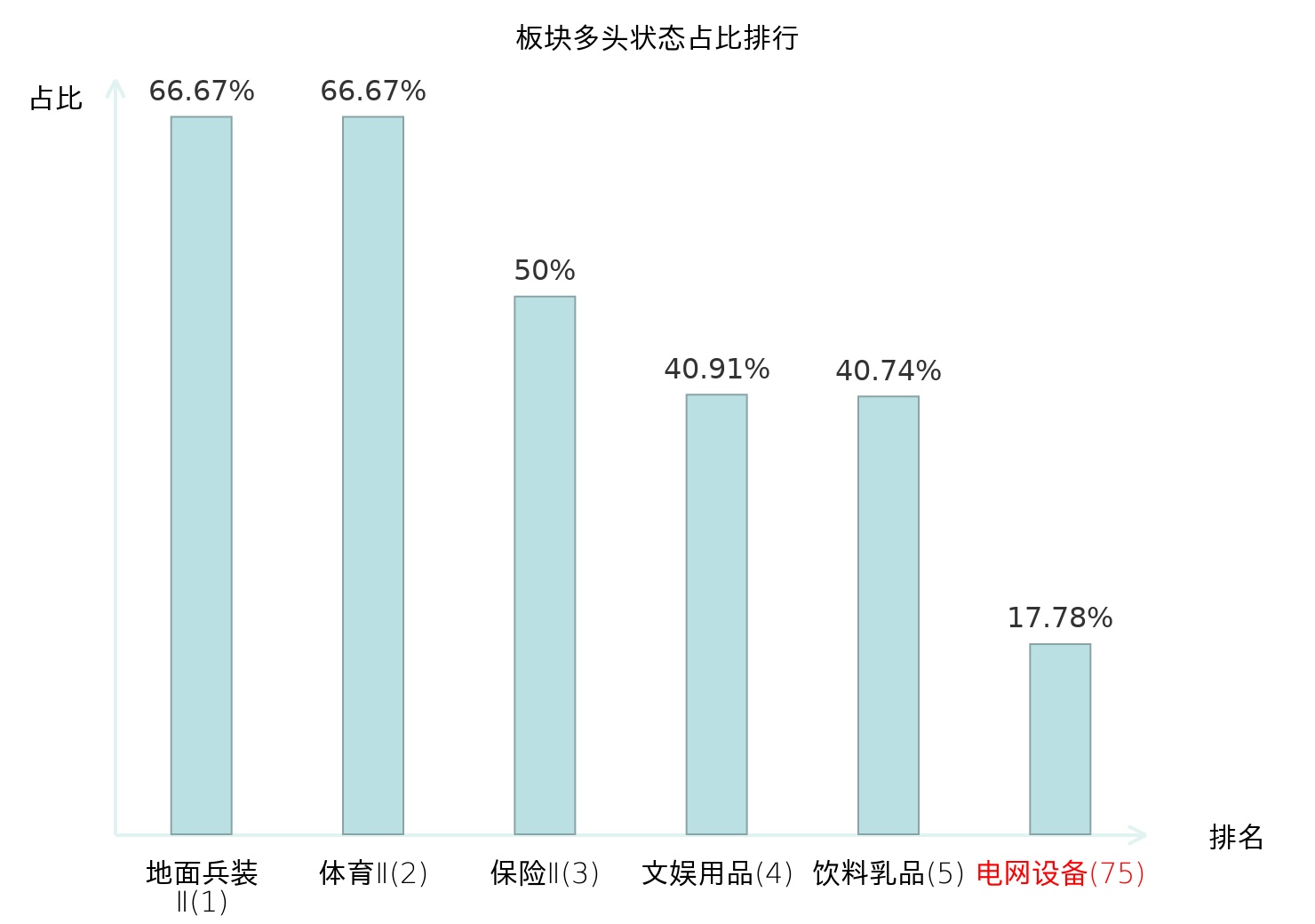 全市场所有行业板块中主力多头状态占比排名中,地面兵装Ⅱ板块位居第一。电视广播Ⅱ板块名次提升最快,较昨日上升82位。
