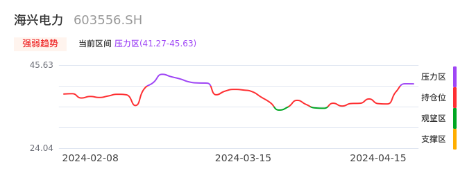我们来看一下该股的九方特色指标强弱趋势的情况:海兴电力近日从持仓区进入压力区。股价出现一波快速拉升行情,目前上升动能较为充足可继续持股。注意今日上方压力位:45.63元是否能有效突破。