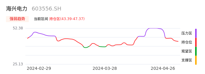 我们来看一下该股的九方特色指标强弱趋势的情况:海兴电力自04月23日从压力区回到持仓区。股价近期持续调整。后续重点关注能否站稳多空分界点:43.39元。如被有效击穿则将进入空头行情。