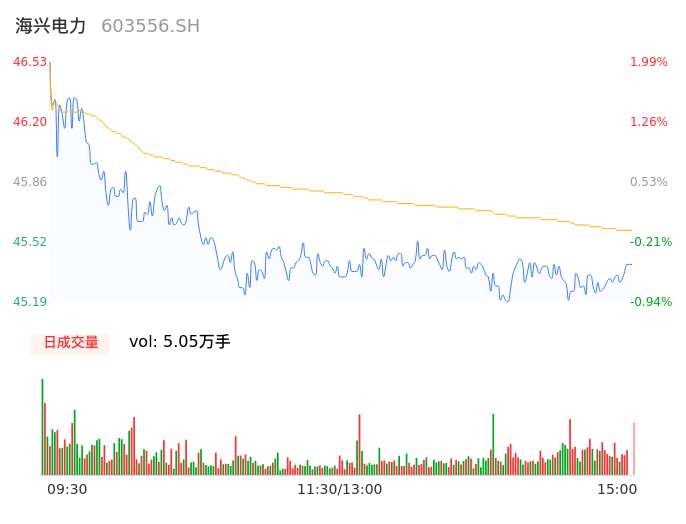 04月26日,海兴电力收报45.51,股价涨幅-0.24%,成交金额2.30亿元,换手率1.03%。