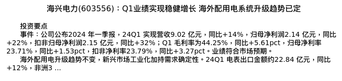 值得注意的是:2024年04月东吴证券的曾朵红/谢哲栋分析师,首次发布关于海兴电力的研究报告,标题为:海兴电力(603556):Q1业绩实现稳健增长 海外配用电系统升级趋势已定。