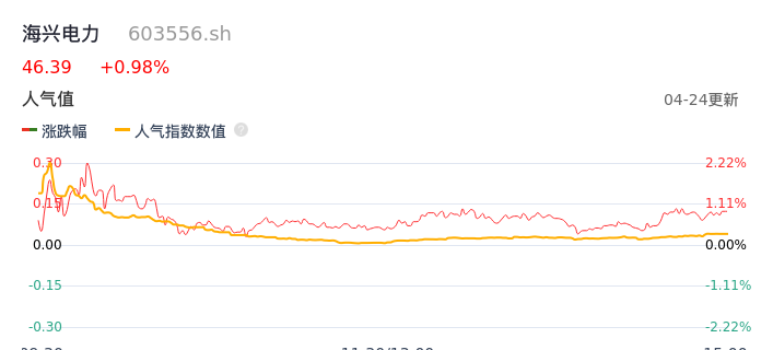 04月24日,海兴电力收报46.39,股价涨幅0.98%,成交金额2.80亿元,换手率1.24%。