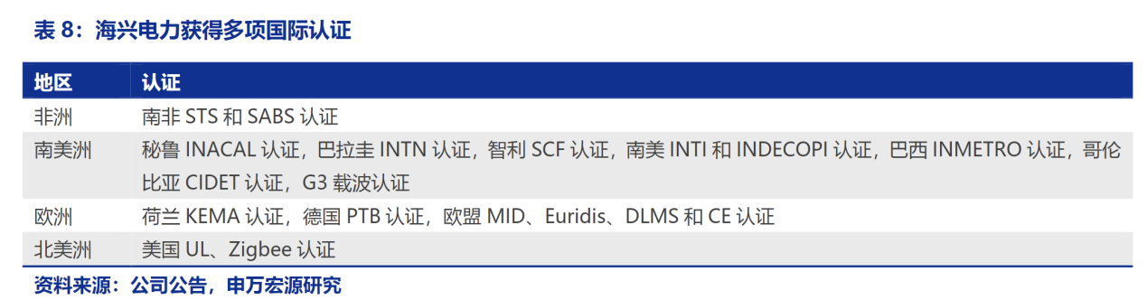 在国内积极参与招标,在海外积极参与海外本土的电表+通信技术标准的制定与获得相关认证,并在原有主业上拓展智能配网及新能源业务。海兴电力在2020年至2023年期间,公司在国网的电能表招标中标金额呈增长趋势,从2020年的3.46亿元人民币增长至2023年的6.36亿元人民币,中标金额占比在在2.44%至3.39%之间。在近三年的国网总部电能表招标中,海兴电力均为TOP10供应商。同时,公司为拓展海外市场,积极参与海外本土电表的标准制定以及获得相关技术认证。公司获得了多项国际认证,包括南非STS和SABS认证、南美INTI和INDECOPI认证、德国PTB认证、欧盟MID认证和美国UL认证、Zigbee认证等。海兴电力是国内较早研发ANSI美国标准系列产品和欧洲智能电表标准的企业之一,同时也是我国智能电表行业中获得国际认证最多的公司。在公司原有的主营业务的基础上,公司凭借较强的技术实力与丰富的运营经验,同时开展了智能配网业务与新能源业务。2020年1月,公司收购了利沃得63%的股份,通过利沃得公司,海兴电力能够提供一系列高质量的新能源产品,涵盖逆变器、电池、充电桩、监控系统及配件等核心领域。凭借海兴电力在海外的完善的供应链及深厚的销售渠道,未来新能源业务有望成为公司的第二增长曲线。