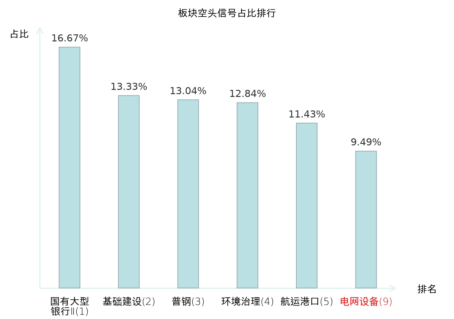 全市场所有行业板块中主力空头信号占比排名中,国有大型银行Ⅱ板块位居第一。环境治理板块名次提升最快,较昨日上升123位。
