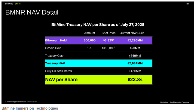 Bitmine于6月30日启动以太币储备计划,如今已以115万枚以太币(价值52亿美元)成为全球最大以太币储备公司。该公司仍在运营矿场及托管服务,多元化收入渠道将与其以太坊战略形成互补。通过发行股票收购以太币的模式,Bitmine效仿了Strategy的策略并适配以太坊智能合约生态,未来可能通过质押收益和DeFi整合提升股东价值。